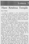 The writer, a Christian, raised many issues including the violent nature of Hindus (and Hare Krishna worshippers?) I deal here primarily with the obeyance of laws. However, I offer some words to reassure him from fears of violent chanting: “Therefore do not worry about tomorrow, for tomorrow will worry about itself’. [New Testament, Matthew 6:34]. “I sought the Lord, and he answered me; he delivered me from all my fears”. [Psalm 34, of David, when he pretended to be insane.]