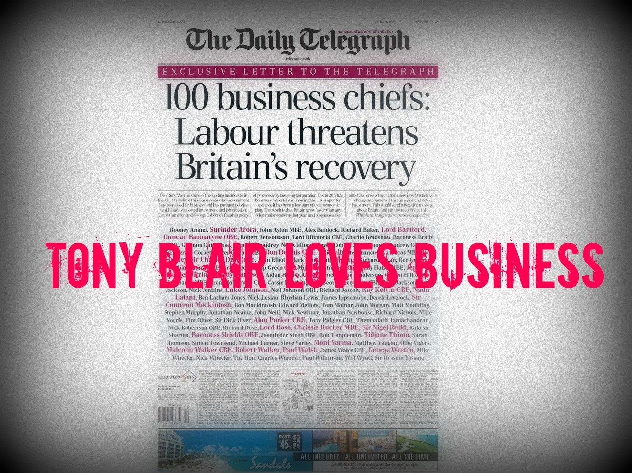 As 100 business leaders openly declare that they back the Conservatives, let’s make one thing clear: Labour understand business, too. I mean, look at how good a businessman Tony Blair is. This might just the problem with their brand of socialism – it’s straight out of Animal Farm. Champagne socialism, two-Jags Prescott socialism. And if you think I’m unfair calling it ‘socialism’ – well, last Thursday, Ed Miliband himself called it a party of Democratic Socialism.